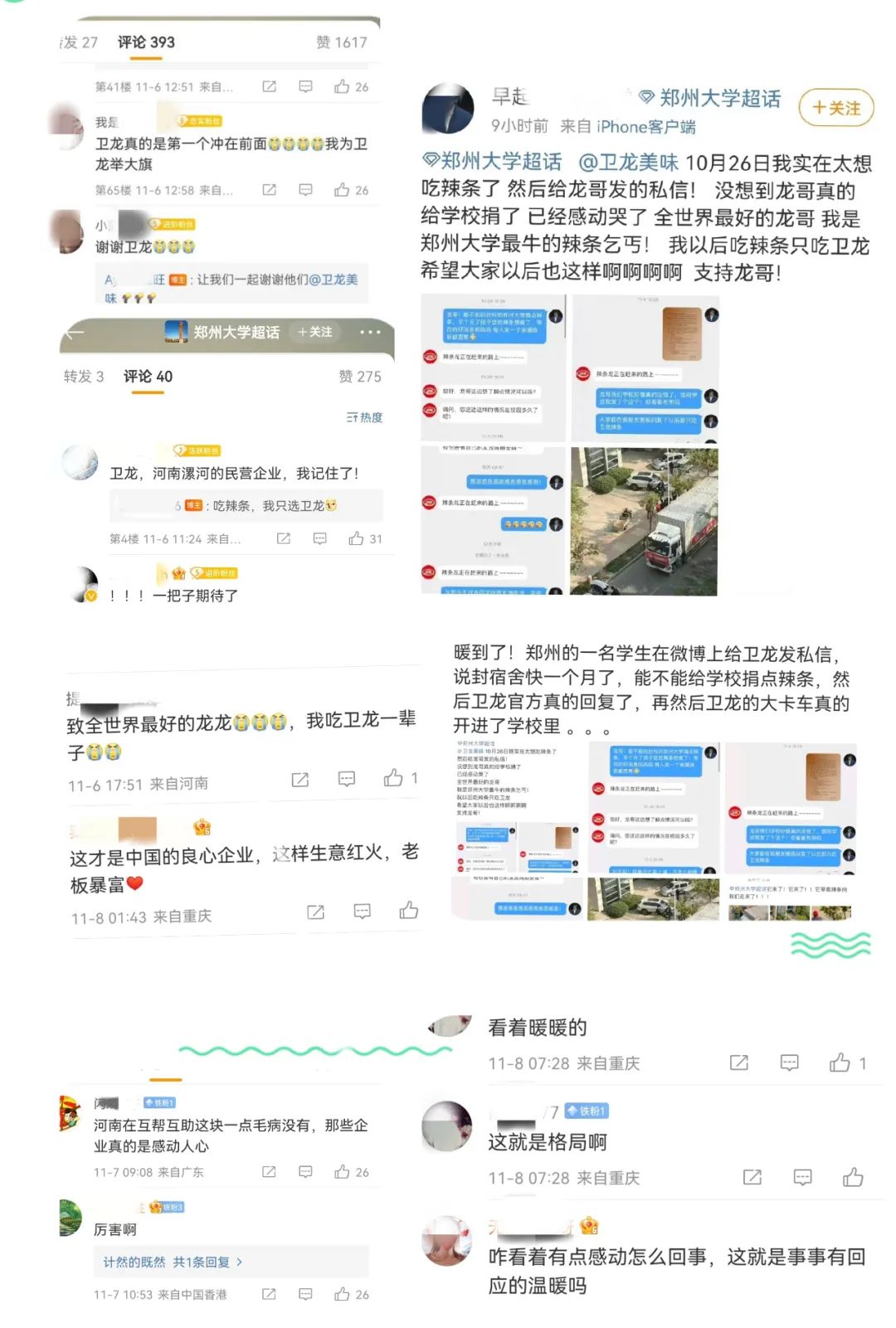 正筹备援助行动时,一位同学在微博上发来了告白留言,让忙碌着的卫龙伙伴更坚定行动的意义。